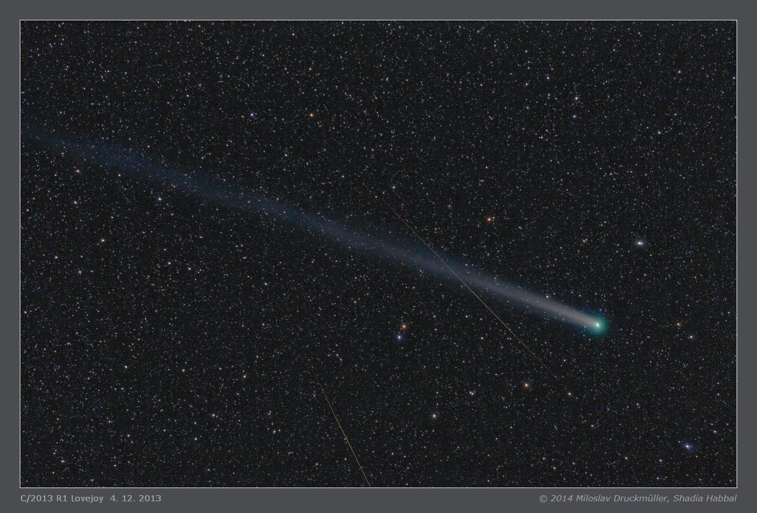 During acquiring data for this image of Lovejoy comet two bright Geminids were recorded. The first one