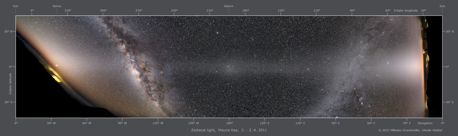 The gegenschein in zodiacal light has elongation of 180°. Planet Saturn was very near to its