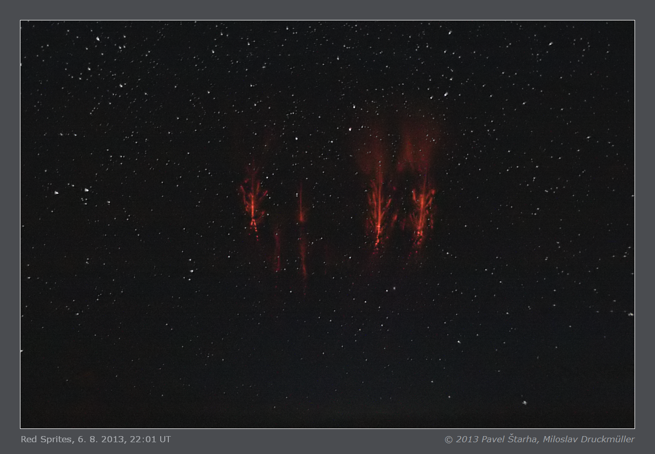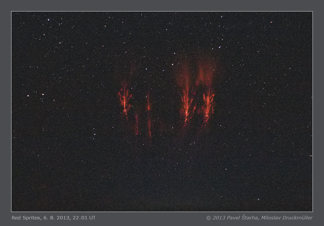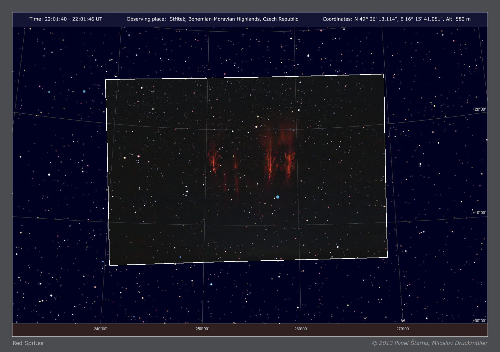 Red sprites are optical phenomena which occur above active thunderstorms. It seems that they are correlated with positive cloud-to-ground (CG) lightning discharge (only 10 % of all lightnings are positive CG, the majority are negative ones). Red sprites appear very high above thunderstorms in altitudes from about 30 to 90 km. The brightest part of a red sprite is typically located between 50 and 75 km above the ground and its duration is only a few milliseconds. The red color is mainly caused by the excitation of molecular nitrogen. There are several theories explaining the red sprites however the phenomenon is not fully understood yet. The exact position of the red sprite in the sky is shown in this star map generated by the Sky Charts software.