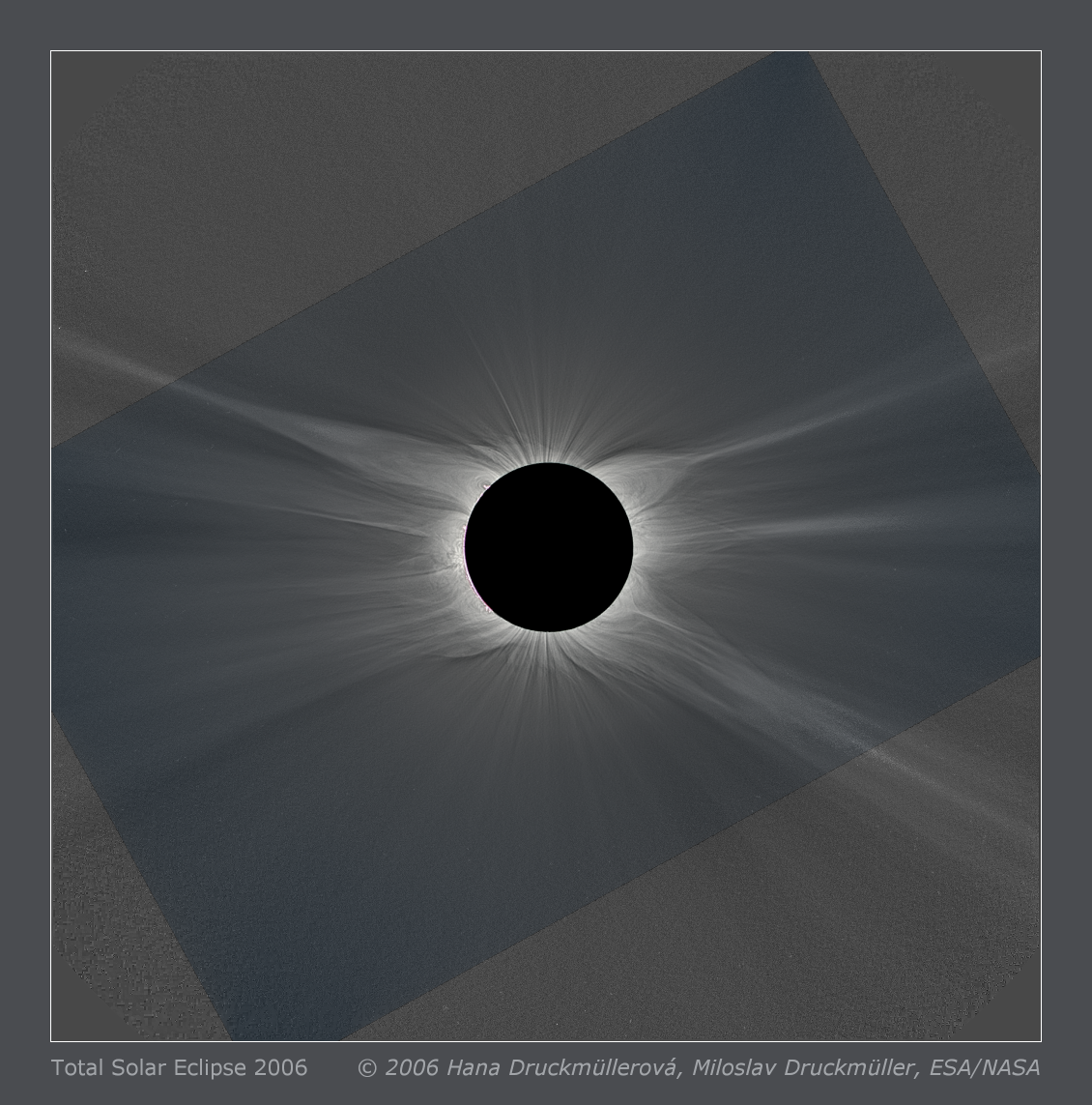 | Processing | Composition of 63 images. Eclipse images were aligned by means of phase correlation, composed using of LDIC 4.0 software, processed using Corona 4.0 in order to visualize coronal structures. Final processing was done using ACC 6.0 software. Image processing by Miloslav Druckmüller and Hana Druckmüllerová |
