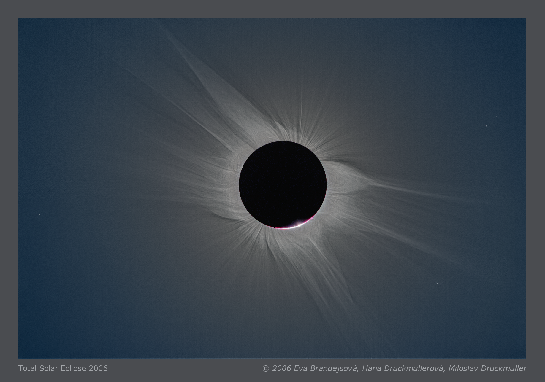 | Processing | Composition of 63 images digital images (D) and one image taken on classical film (B). Eclipse images were aligned by means of phase correlation, composed using of LDIC 4.0 software, processed using Corona 4.0 in order to visualize coronal structures. Final processing was done using ACC 6.0 software. Image processing by Miloslav Druckmüller and Hana Druckmüllerová |