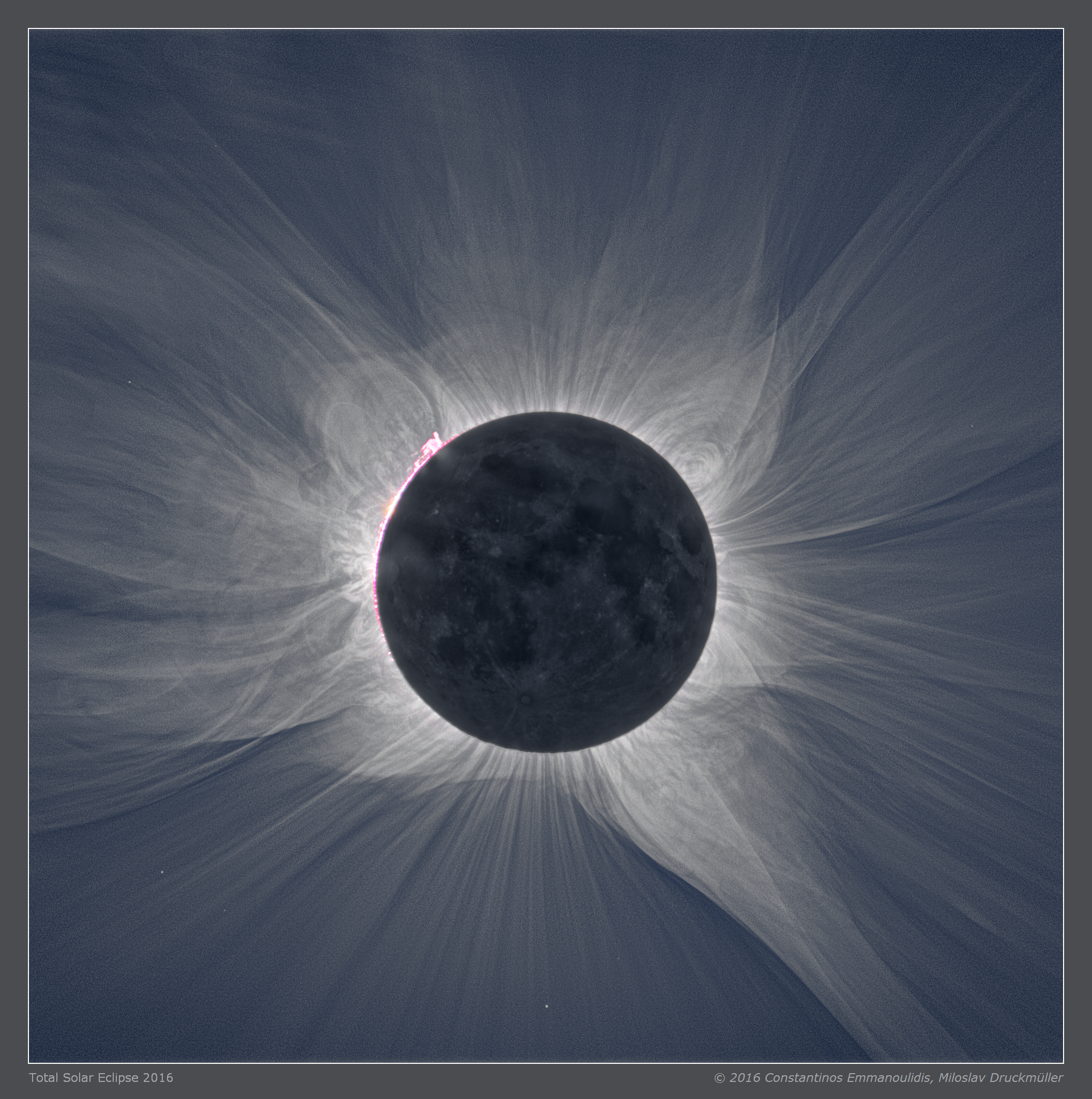 ProcessingComposition of 24 eclipse images. Eclipse images were calibrated by means of dark frames and flat-fields, aligned by means of phase correlation, composed by means of LDIC 5.0 software, processed using Corona 4.1 in order to visualize coronal structures. Final processing was done using ACC 6.1 software.