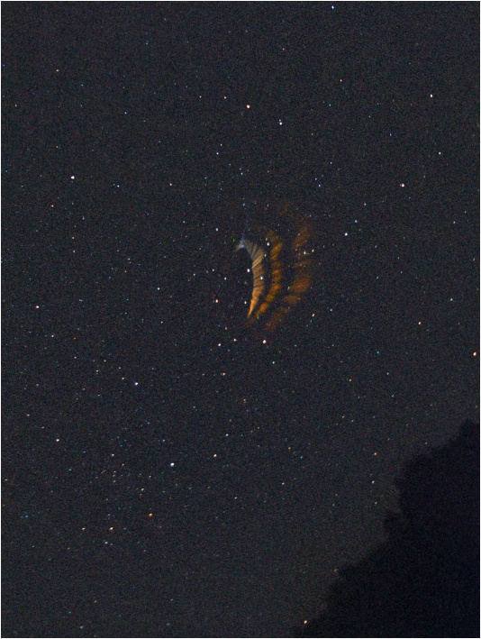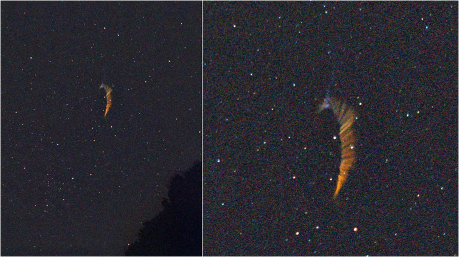 ![]() Expozice snímku byla zahájena asi 15 sekund po přeletu bolidu. Délka expozice je 1 minuta. Bolid prolétl na obrázku shora dolů. Pozoruhodná je barva stopy. Stopa začíná modrým obláčkem a její barva se mění postupně na červenooranžovou. Patrný je velice výrazný pohyb během minutové expozice. Levý obrázek ukazuje celkový pohled (tmavá skvrna vlevo dole je okraj lesa), vpravo je detail. Celkem jsem pořídil během 8 minut 4 snímky stopy. Tři z nich jsem sestavil do animace (nekomprimovaný formát AVI). První snímek animace je totožný s výše uvedeným. Druhý snímek je 40sekundová expozice zahájená v 04:22 a třetí je dvouminutová expozice již značně zesláblé stopy v čase 04:25 - 04:27. Animace zachycuje tedy asi 8 minut vývoje stopy. Pozoruhodný je především protisměrný pohyb různých částí stopy svědčící o značné složitosti proudění ve vysoké zemské atmosféře. Pro názornost jsem snímky, ze kterých je vytvořena animace, složil též do jednoho snímku.