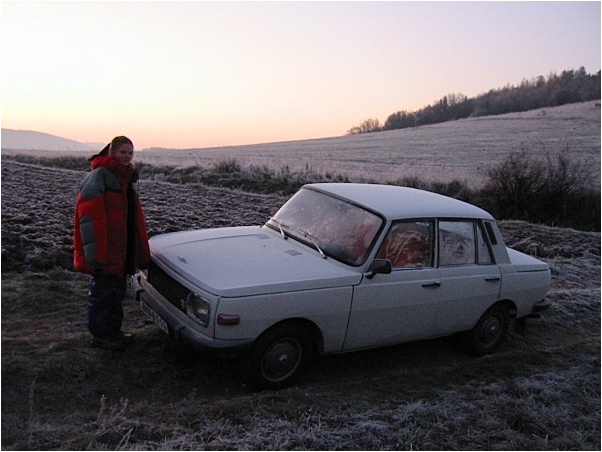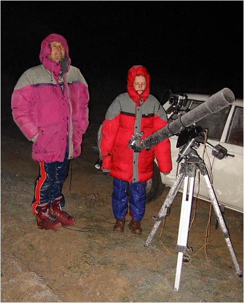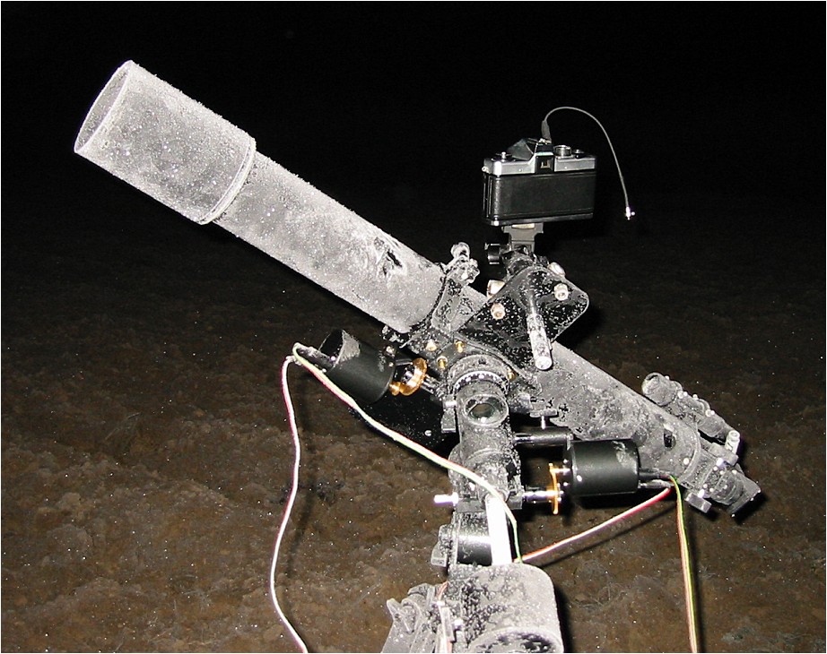 ![]() Po nádherném bolidu v 04:20 následovala ještě řada krásných jasných meteorů, ale žádný se jeho jasnosti již ani zdaleka nepřiblížil. Pozorování a fotografování jsme ukončili až ráno, kdy denní světlo pozorování nádherného divadla znemožnilo. Ještě v době, kdy už bylo světlo a byly sotva vidět nejjasnější hvězdy, jsme spatřili na východě na oranžové ranní obloze jasný bolid. Škoda, že Slunce neudělalo výjimku a nevyšlo o nějakou tu hodinu později. Divadlo zřejmě pokračovalo a bylo jistě úchvatné. Závěrem ještě přikládám několik náladových obrázků naší malé expedice. Snímek omrzlé paralaktické montáže ilustruje, že podmínky byly v noci skutečně mrazivé.