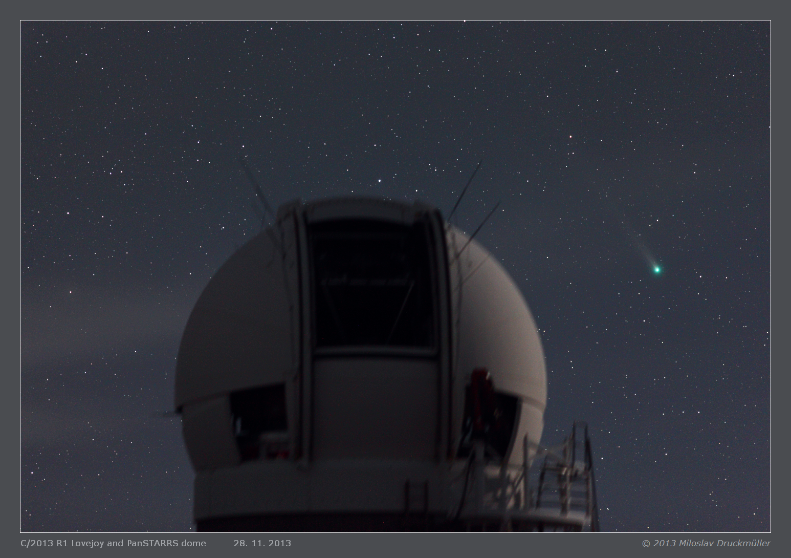 Comet Lovejoy and Moon-lit dome of PanSTARRS telescope.