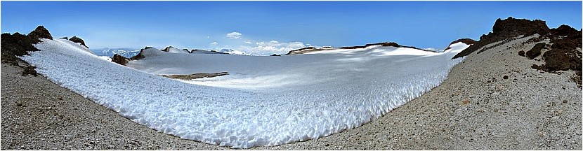 Pohled do kráteru (průměr 1,4 km), 180° panorama