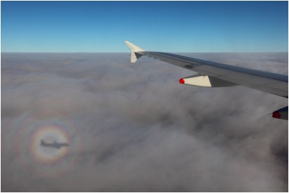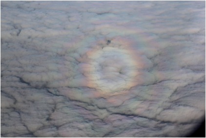 Multi-ring glory surrounding the shadow of an aircraft near the clouds