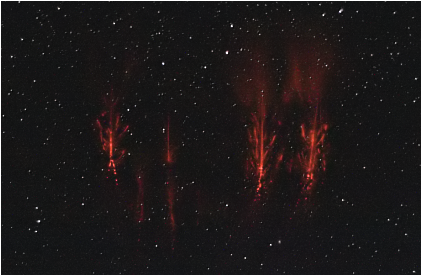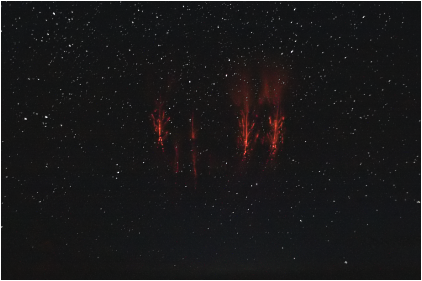 The extreme weather in the Czech Republic continued in the beginning of August 2013 by period of extremely high temperatures (daily maxima 36-38°C). This period was terminated by a cold front accompanied by intense and devastating thunderstorms. In the evening of August 6, there were intense thunderstorms were above Bohemia, but the sky was clear above Moravia. My friend Pavel Štarha was monitoring, as usually, the weather carefully and called me that there was an excellent situation for observing of red sprites above the thunderstorm. We agreed on camera, optics and exposure strategy. Pavel used full advantage of his observing place in the Bohemian-Moravian Highlands which was rather near the thunderstorm (about 130 km) and still with clear sky. Finally he brought 12 images of red sprites and plenty of calibration data. The images presented on this page are the result of rather complicated and time consuming processing aimed on removing the background caused by light pollution, precise color calibration, careful filtration of color noise and preserving the sky background with stars.