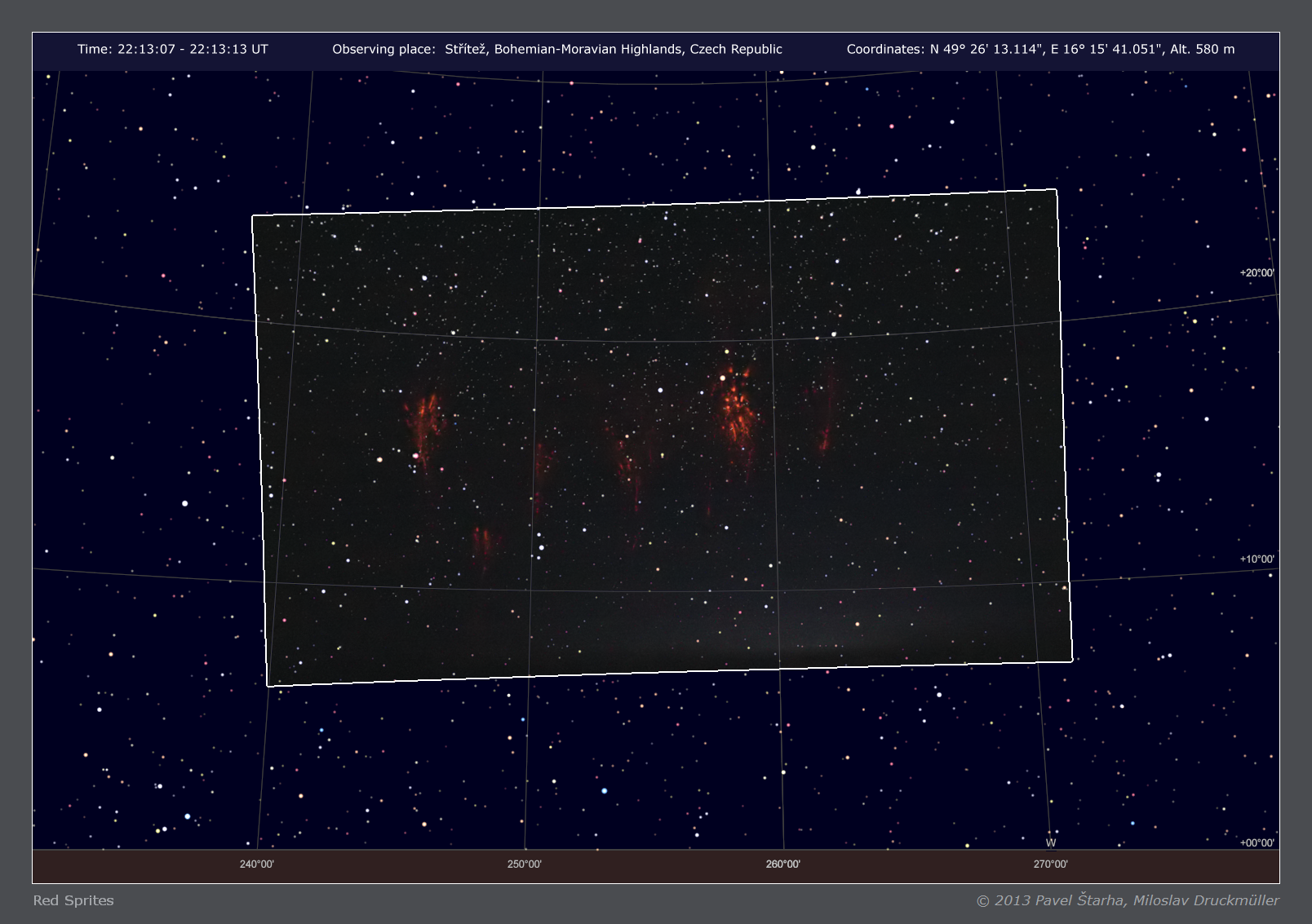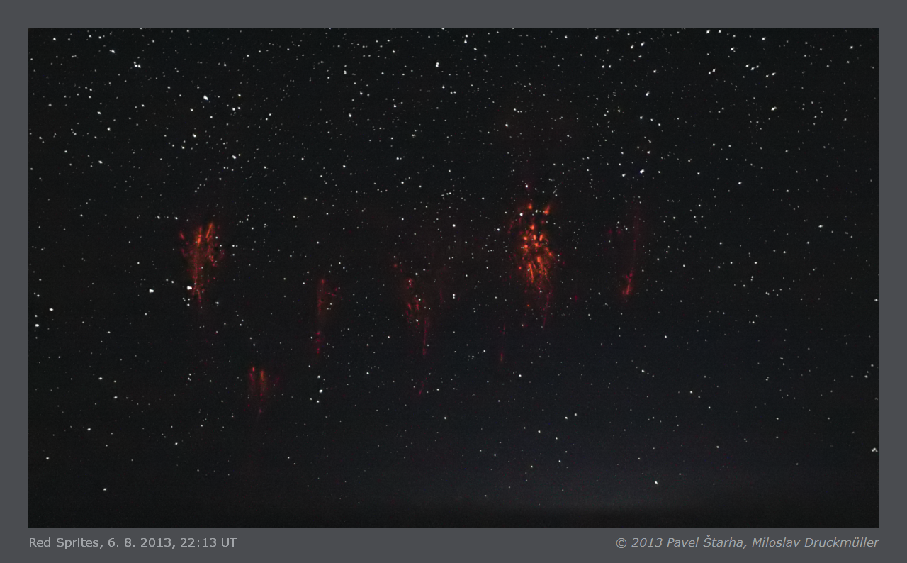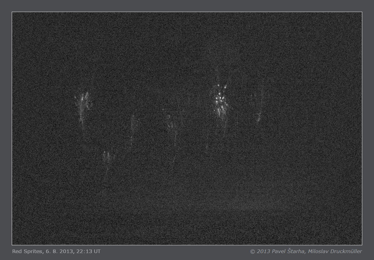This group of red sprites was visible above the western horizon in the altitude from 10° to