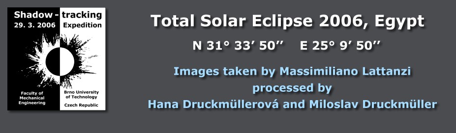![]() ![]() Massimiliano Lattanzi from Italy joined the Shadow-tracking Expedition project long before the eclipse. He took full advantage of the excellent observing conditions in Sahara desert and obtained a valuable set of digital images. The processing took me and my daughter Hana relatively long time because we had to overcome problems with processing of Nikon D 70 images. The Nikon software, on the contrary to Canon, doesn't allow to extract linear images from the NEF format, what we need for our image processing techniques. Finally the problem was partially solved by Iris software, which enables to extract the raw unprocessed image matrix, and partially by our own software which we made for this purpose. The resulting images show the corona up to 2-3 solar radii in extraordinary details. Page versionfor slowInternet connection