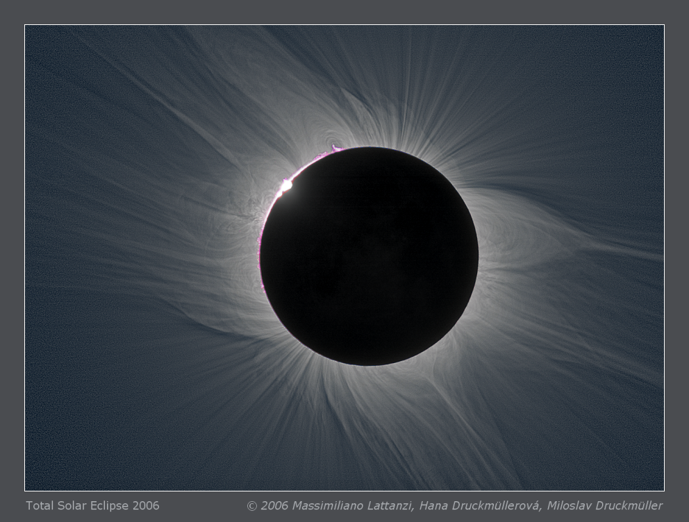 | Processing | Composition of 59 images. Eclipse images were extracted from NEF format using Iris 5.32, aligned by means of phase correlation, composed using of LDIC 4.0 software, processed using Corona 4.0 in order to visualize coronal structures. Final processing was done using ACC 6.0 software. Image processing by Miloslav Druckmüller and Hana Druckmüllerová |
