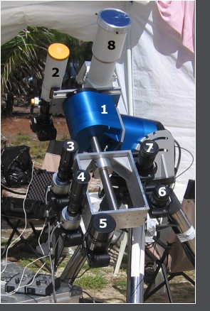 (2) William Optics Megrez 88 Doublet FD + Baader Flat-field FFC, EFL 965mm with Canon EOS 5D camera. (3,4) Two 8/500 mm lenses and Canon EOS 5D cameras equipped with two extremely narrow-band filters - bandwidth 0.15 nm. The first filter maximum transmission centered on Fe XIV emission image 530.3 nm. The second filter maximum transmission centered off-line on 529.1 nm. Both used filters were stabilized at temperature of 45.0°C. (5) Maksutov-Cassegrain 3M-6A, 6.3/500 mm with Canon EOS 5D (6) Canon EF 100 nn 1:2 lens with Canon EOS 5D (7) Canon EF 200mm 1:2.8 L II lens with modified Canon EOS 5D (Hutech Ia) (8) William Optics Fluorostar triplet F=7.0 + adapter, EFL 2000mm with Phase One P45+ digital camera. All cameras except for (8) were computer controlled by means of 3 computers. The Linux software Multican created by Jindřich Nový was used for cameras control. The camera (8) was manually controlled by Peter Aniol.