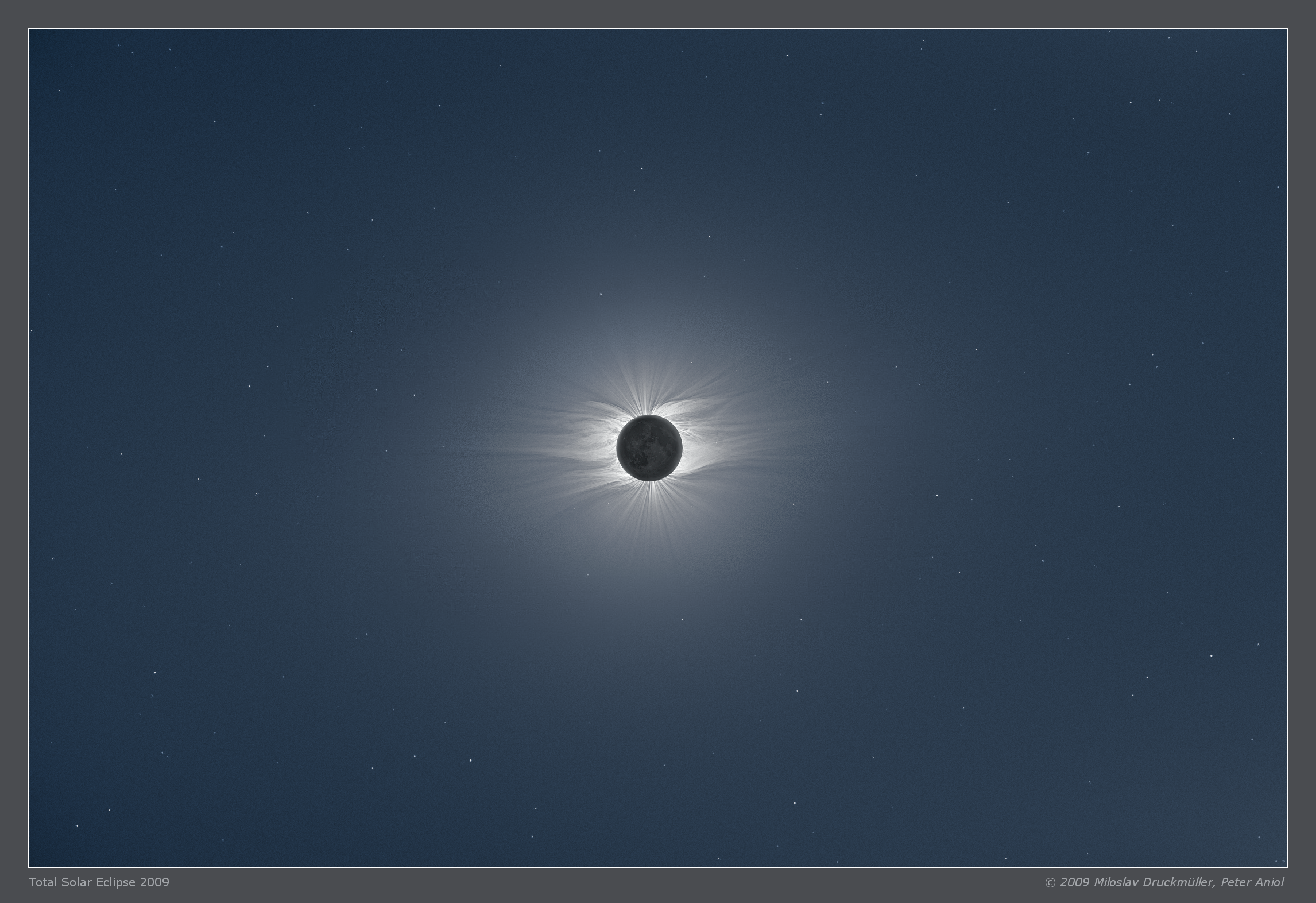 | Processing | Composition of 9 images (Canon 200mm lens) and 38 (Maksutov-Cassegrain) eclipse images. Eclipse images calibrated by means of dark frames and flat-fields, aligned by means of phase correlation, composed by means of LDIC 5.0 software, processed using Corona 4.1 in order to visualize coronal structures. Final processing was done using ACC 6.1 software. Image processing by Miloslav Druckmüller |