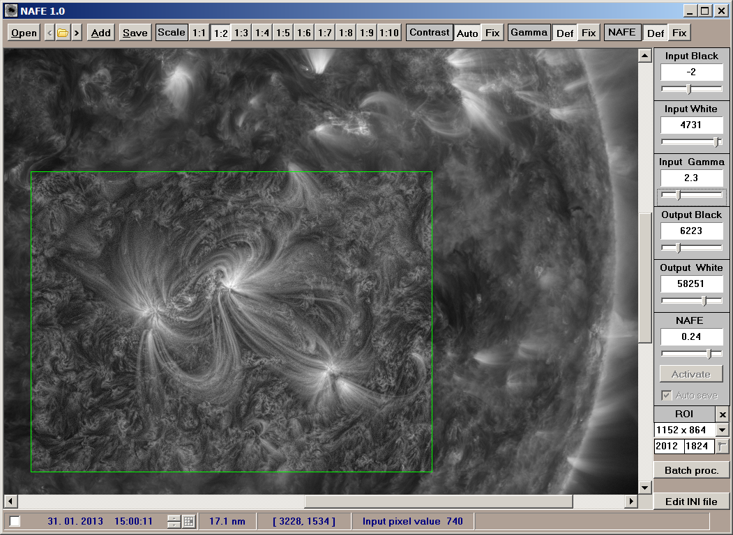 The mathematical background of NAFE method of images enhancement is described in NAFE paper. Pre-defined input NAFE weights for all SDO AIA wavelengths can be changed in NAFE.ini file. The values written in the NAFE.ini file are NAFE weights multiplied by 100 and the number must be integer (i.e. 15 means the NAFE weight 0.15).