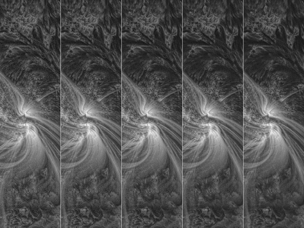 SDO AIA 171 Å image (NAFE weight 0.2) with NRSigma 10, 20, 30, 40, 50 (from the left to the right).
